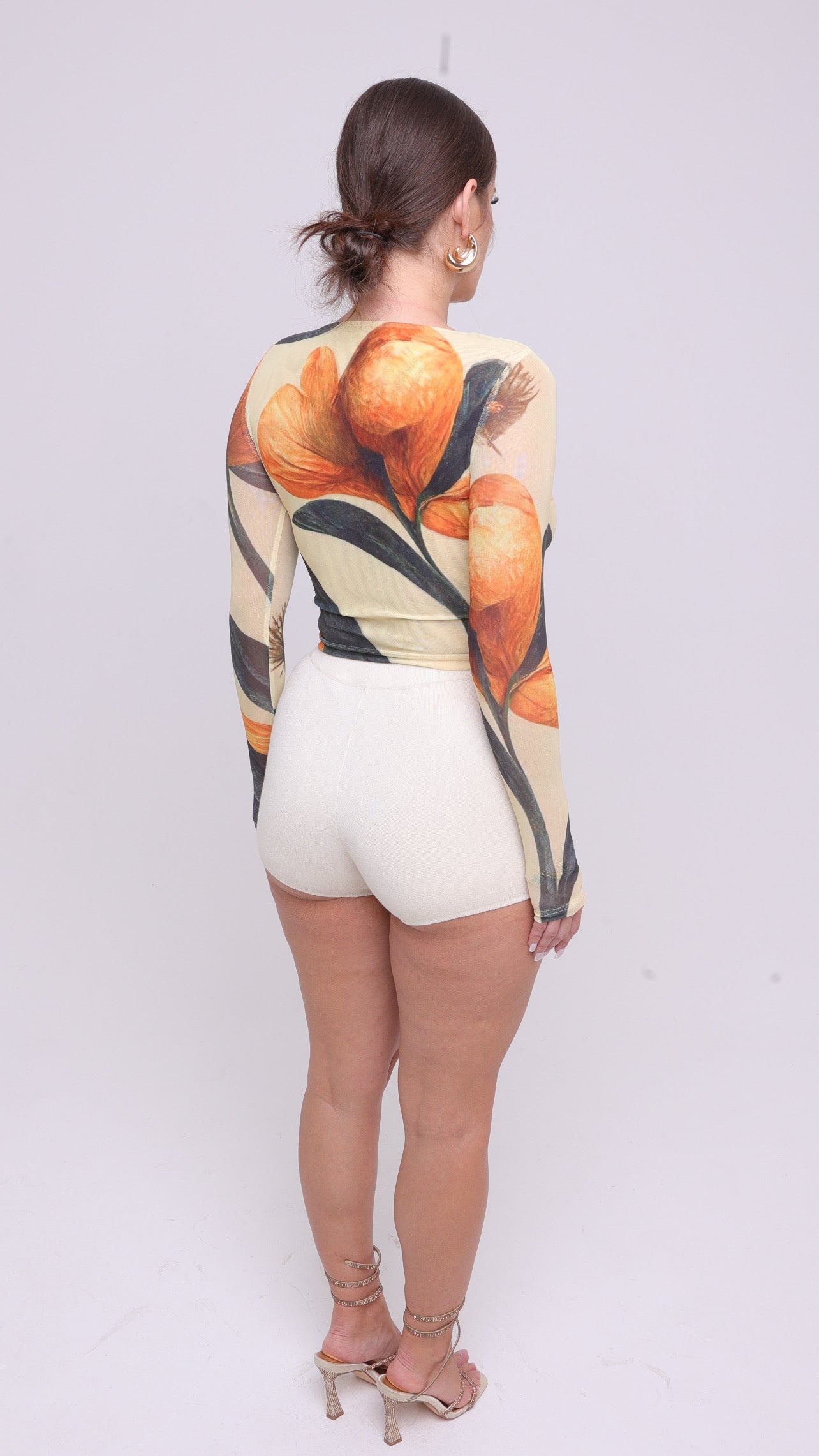 Fleur es una prenda que no te hace pensar demasiado, simplemente la eliges. Su corte cropped de manga larga se adapta cómodamente al cuerpo, con un suave escote barco que estiliza la figura sin complicaciones. Confeccionada en nuestra malla elástica ligera y semitransparente, es suave al tacto, refleja la luz a la perfección y aporta un toque sutil a cualquier look.