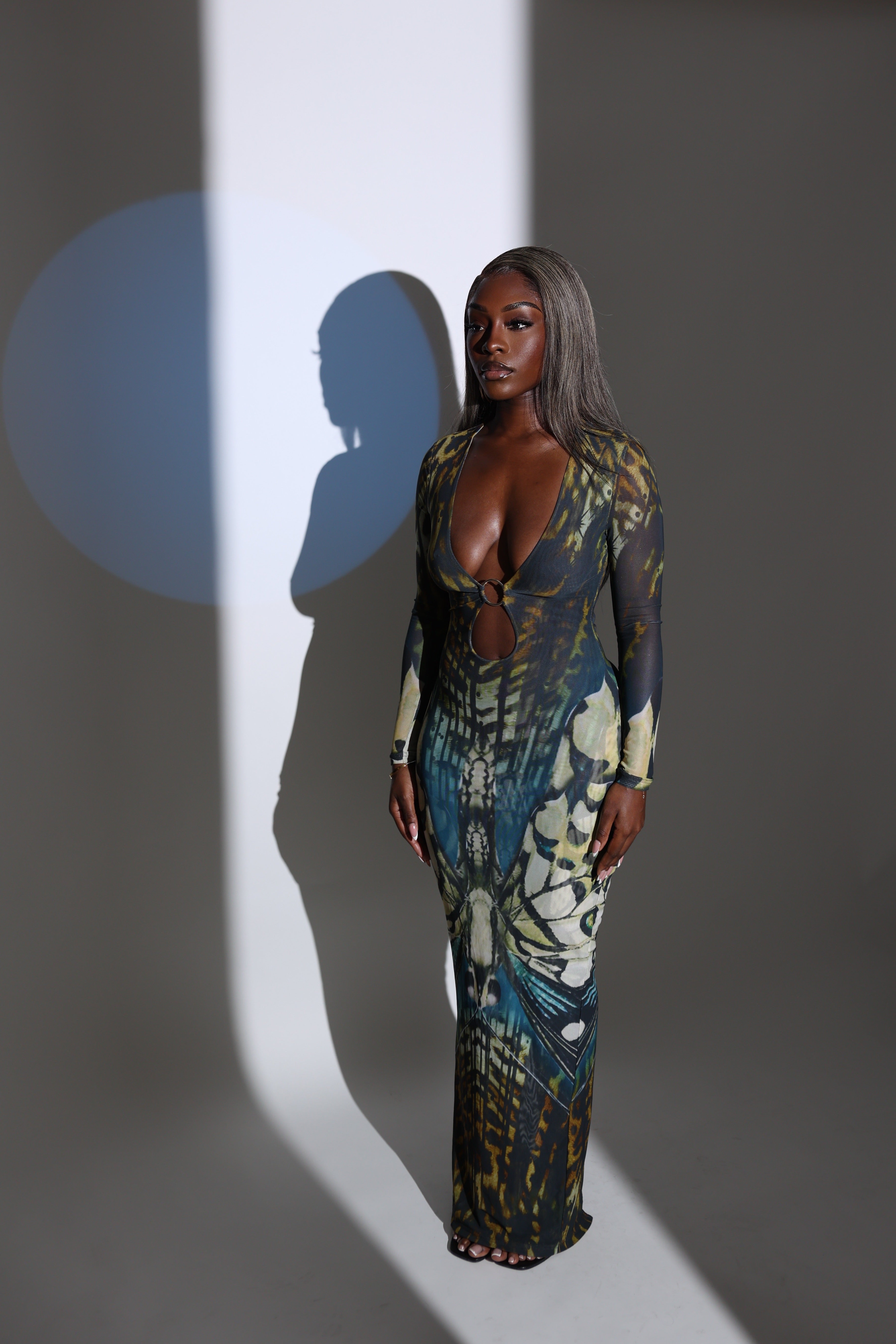 Su largo hasta el suelo aporta un toque de dramatismo sutil, con un detalle de aro frontal que atrae todas las miradas sin recargar el look.
