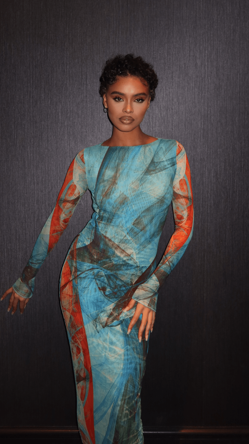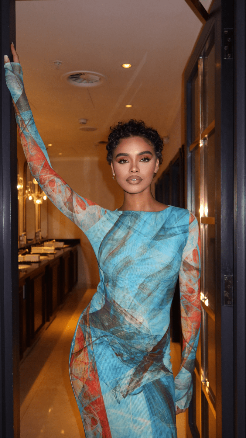 Artful and refined, the Delilah Dress blends fluid lines with modern elegance. Crafted from stretch mesh, it drapes softly over the body, creating a streamlined silhouette that feels both effortless and intentional. Long sleeves add balance, while the print placement enhances shape and dimension.