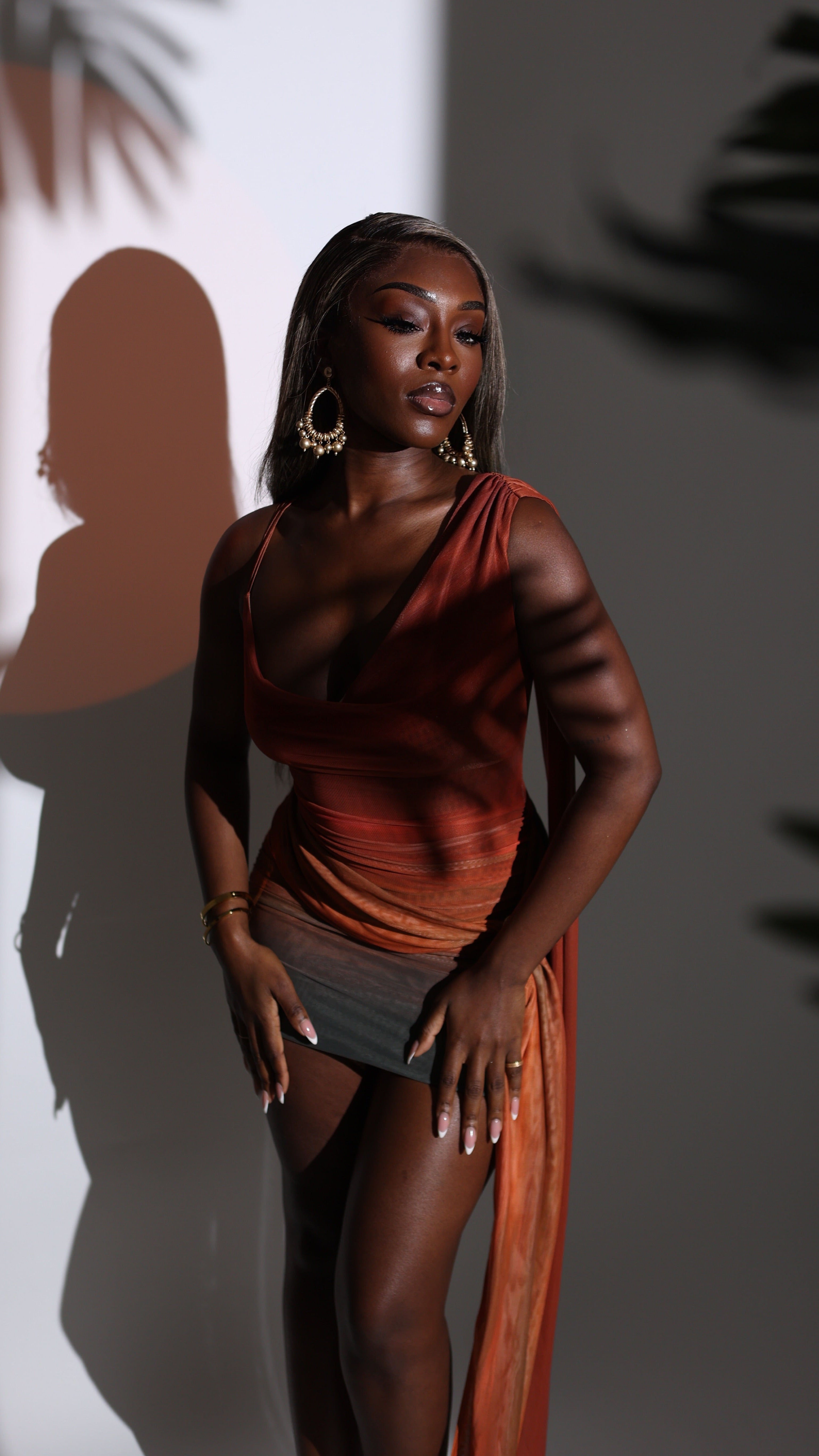 Siena is the dress that moves with you, catching the eye without effort. The stretch mesh drapes softly over the body, with a fluid cowl neckline and one-shoulder silhouette that feels effortless and refined. Rich sunset tones of burnt orange and deep olive catch the light, while a gathered side drape with a gold accent adds subtle movement and elegance.
